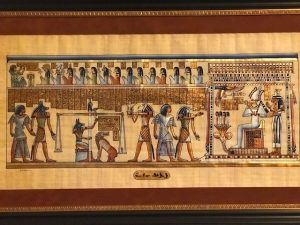 Finally, another powerful symbol from the painting is found in the upper left portion of the papyrus, where Hunefer is seen crouched down, as he pleads with an apparent jury of deities, professing a good life and seeking their praise and mercy. In similar paintings, such as The weighing of the heart of the Scribe Ani in the Great Scales in the Hall of Osiris, these deities are sometimes described as a “divine jury.”